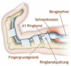 Beim schnellenden Finger kommt es durch eine Verdickung der Beugesehne zu einen Stocken der Fingerbewegung und dann zu einem ruckartigen Weiterbewegen des Fingers nach Überwindung eines gewissen Widerstandes. Die Sehnen der Finger werden von sogenannten Ringbändern am Knochen geführt, wie die Ringe einer Angel die Angelschnur führen. Die Abbildung verdeutlicht das Problem des Springfingers / des schnellenden Fingers